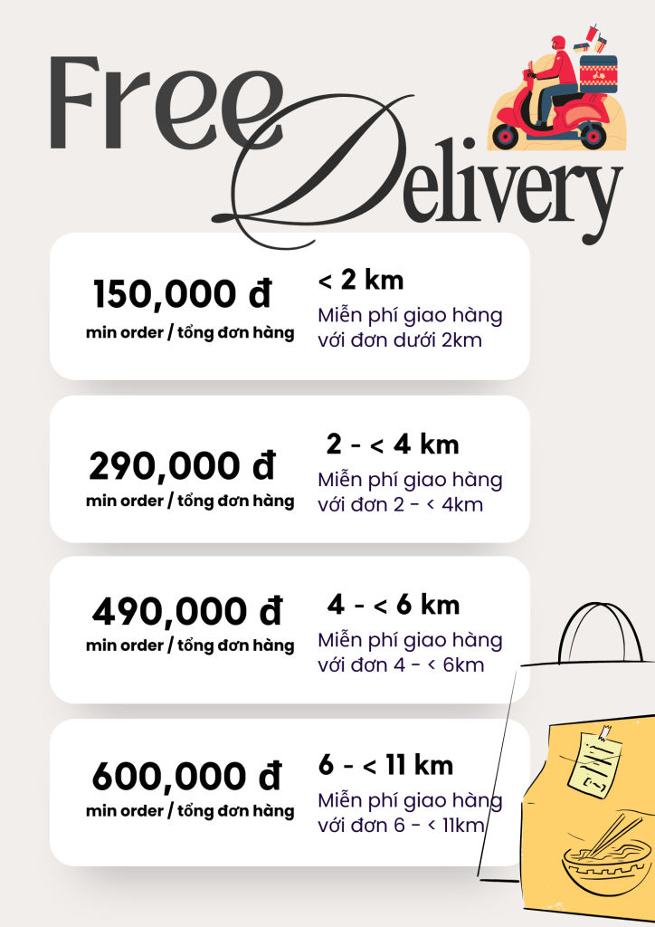 Tận hưởng miễn phí giao hàng khi đơn hàng của bạn đạt giá trị tối thiểu. Dù là bữa trưa, bữa tối hay bữa ăn cho nhóm đông, chúng tôi luôn sẵn sàng phục vụ 🍽️